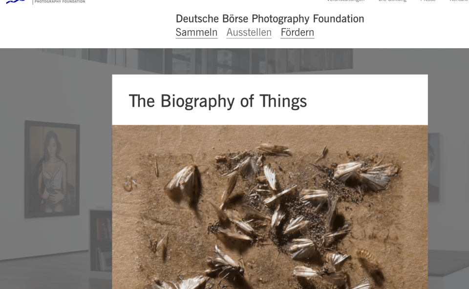 „The Biography of Things“ ist eine Kooperation der Deutsche Börse Photography Foundation und der Fotoklasse Liebscher der Hochschule für Gestaltung (HfG) Offenbach sowie Studierenden des Studiengangs Curatorial Studies der Goethe-Universität und der Hochschule für Bildende Künste/Städelschule in Frankfurt/Main. Auf Initiative der Deutsche Börse Photography Foundation kuratieren die Studierenden des Frankfurter Masterprogramms Curatorial Studies eine Ausstellung mit fotografischen Werken der Klasse Liebscher der HfG Offenbach. Ausstellungsort ist The Cube, Eschborn, Unternehmenssitz der Deutsche Börse AG. Ziel des Projekts ist es, beiden Studiengängen die praktische Erfahrung zu ermöglichen, eine gemeinsame Ausstellung zu realisieren. Auf einer der Ausstellungsflächen werden rund 80 Arbeiten von 15 Studierenden der HfG gezeigt. Diese werden von einer umfangreichen Auswahl an Werken der Art Collection Deutsche Börse ergänzt, die das Thema ebenfalls reflektieren. In der Frankfurter Innenstadt wird darüber hinaus vom 13. Februar bis zum 5. März 2018 auf der C-Ebene der Hauptwache ein temporäres Ausstellungsprojekt mit Arbeiten von fünf HfG-Künstlern im Außenraum installiert. Zur Ausstellung erscheint ein Katalog.