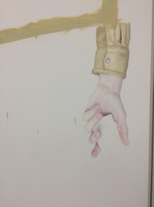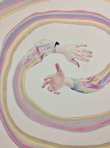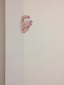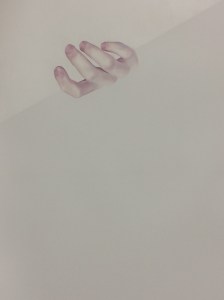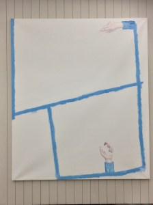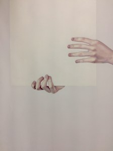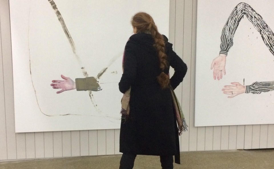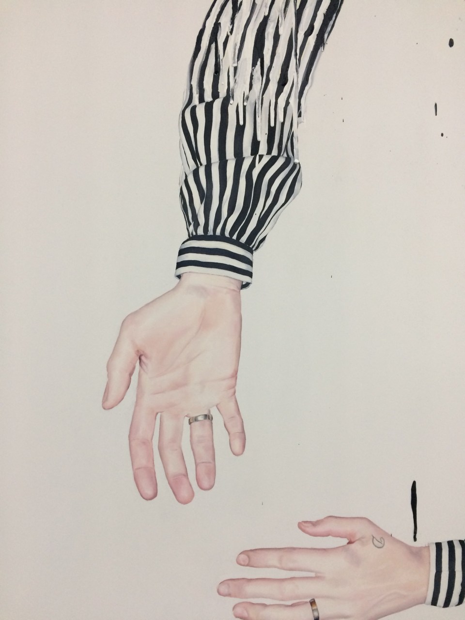 Der Ausstellungstitel kündigt an: „Old Tissues Filled with Tears“. Und löst geradeswegs die Befragung der eigenen Erinnerung aus – an eben solche salz-gehärtet-dröge-zerknüllte Hinterlassenschaften unkontrollierter Gedanken und Gefühlsausbrüche. Douglas (*1984, N.Y.C.) gibt in dieser Werkreihe vornehmlich Händen und Armen eine Stimme, manchmal Füßen, selten Dingen. Programmatisch in den 14 Arbeiten ist die Abwesenheit menschlicher Körper. Die Abwesenheit von Leben. In ihren Bewegungen festgehalten sind die Hände wie bei fotografischen Momentaufnahmen. Ihre Verbindungen zueinander sind selten harmonisch, oft gebrochen oder völlig disconnected, Linien, mal unbeholfen-eckig, mal stark-kreisformig ausformuliert oder auch monochrom-konkrete Farbflächen händelnd. Daneben die Irritation durch wahrhaft fotorealistisch dargestellte Dinge wie eine Dose, Visitenkarte oder ein Paar Turnschuhe. Nicht zum Körper gehörend und doch so überaus relevant, dass die Künstlerin sie in den Bildraum hereinlässt und ihnen sogar die größtmögliche Aufmerksamkeit schenkt. Im Gegensatz dazu werden handwerkliche Schwächen und Ungenauigkeiten sichtbar an den Extremitäten: von perspektivisch fehlerhaften Fingerstellungen oder Proportionen über unschlüssige Leerstellen, unverständliche Kompositionen, unsaubere Farbklekse auf dem Leinen bis hin zur fehlenden Grundierung.