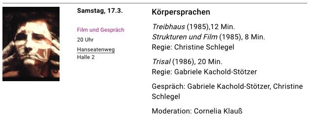Am Abend des 17.3. wird unter anderem „Trisal“ von Gabriele Stötzer gezeigt. Die Erfurter Künstlerin wird persönlich anwesend sein. Weiterführende Information zum Wirken von Gabriele Stötzer findet sich u.a. hier: