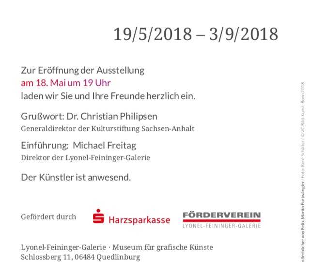 Veröffentlicht am 4. Mai 2018 ]Furtwängler im Lyonel-Feininger-Museum, 18.5.2018 „Felix Martin Furtwängler. PEINTRE GRAVEUR. Buch-Kunst-Druck“ eröffnet am 18. Mai, um 19 Uhr. Ort: Lyonel-Feininger-Galerie Museum für grafische Künste Schlossberg 11 06484 Quedlinburg T: +49 3946 6895938-29 www.feininger-galerie.de www.kulturstiftung-st.de Lyonel Feininger. Sammlung Dr. Hermann Klumpp Dauerausstellung ganzjährig Felix Martin Furtwängler. PEINTRE GRAVEUR Buch-Kunst-Druck 19.5.-3.9.18 Eröffnung: 18.5., 19 Uhr Ähnliche Beiträge