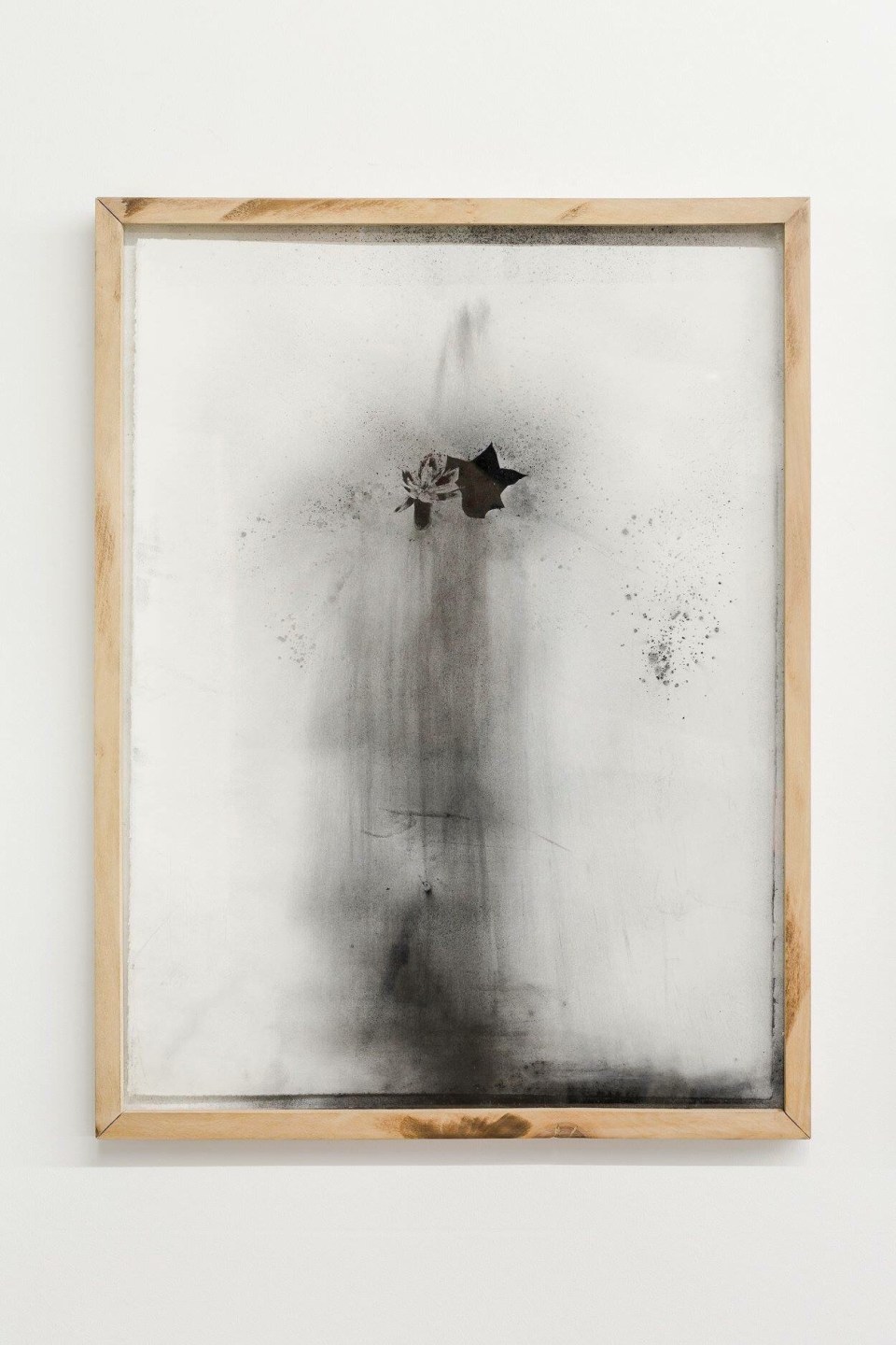 Ähnlich verhält es sich auch mit „Strange Blooms“: die Holzkohle-Drucke sind zwar hinter Glas gebracht, aber allein der Transport von London nach Berlin hat die Bilder erneut gestaltet, die Bewegung der Autofahrt werden durch gelöste Partikel an der Innenseite des Glases ebenso sichtbar wie auf dem Papier. (Je 83x63x3 cm, à 3.500,-€)