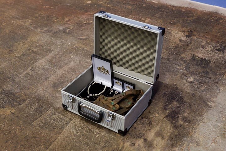 „Residuals (c)“, 2017, Kiste mit Juwelen-Replika der Queen und Maulgeschirr mit Zacken nach außen für frischgeborene Kälber zur unverzüglichen Entwöhnung des Muttermilch-Saugreflexes, damit sie den für den Menschen so wertvollen Rohstoff nicht verzehren.