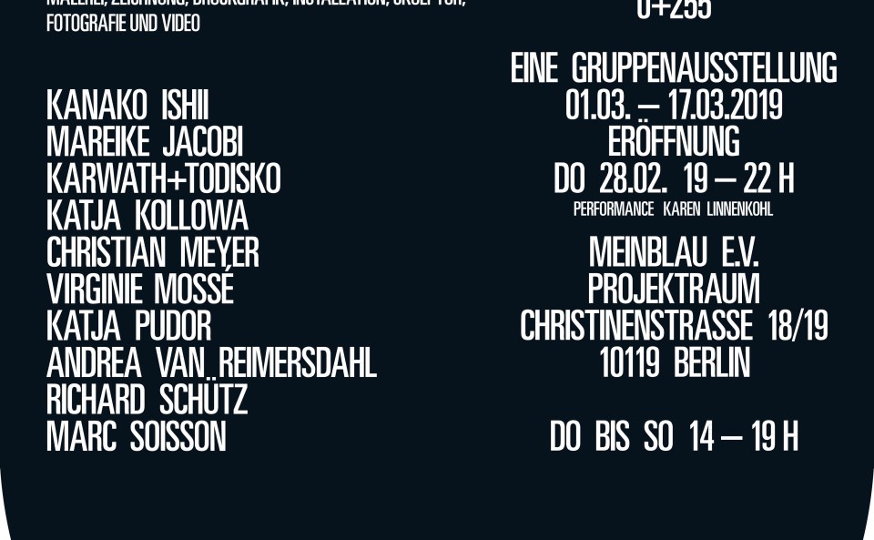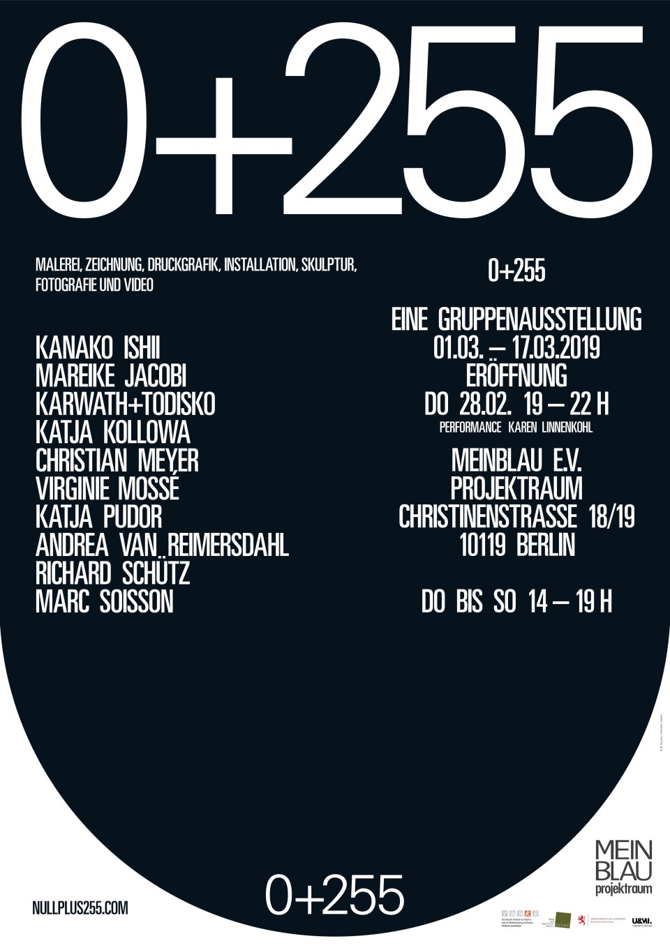 Mit der Gruppenausstellung 0+255 werden zehn Positionen aus Malerei, Zeichnung, Druckgrafik, Installation, Skulptur, Fotografie und Video vereint, die sich programmatisch auf die Verwendung von Schwarz, Weiß und ihre unbunten Abstufungen fokussieren. Die Ausstellung wird gefördert durch das Bezirksamt Pankow von Berlin, Amt für Weiterbildung und Kultur, FB Kunst und Kultur, die Hans und Charlotte Krull Stiftung und durch die Botschaft des Großherzogtums Luxemburg in Deutschland.