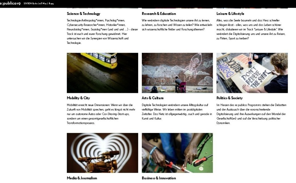 Das Programm-Portfolio kann hier eingesehen werden: https://19.re-publica.com/de/tracks-topics
