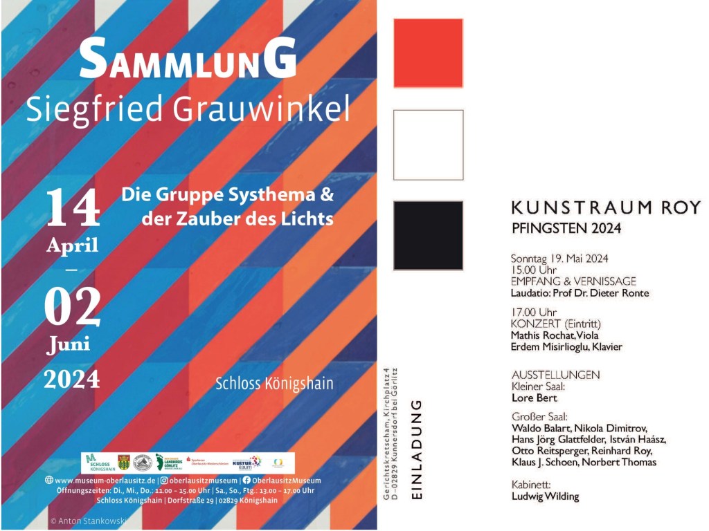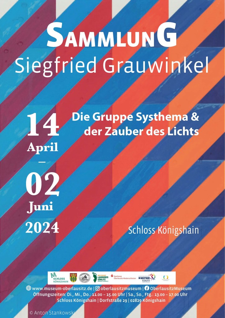 Konkrete Kunst im Doppelpack: Die Sammlungsausstellung „Die Gruppe Systhema & der Zauber des Lichts“ im Schloss Königshain eröffnet mit knapp 60 künstlerischen Positionen am 14. April um 14.30 Uhr. Und am 19. Mai spricht hier um 13.00 Uhr Prof. Dr. Dieter Ronte!