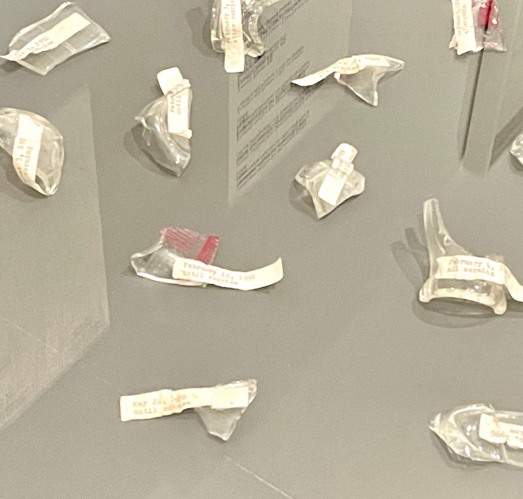 Nicht alles, was die 1933 in Tokio geborene Künstlerin machte, war tiefgründig oder kann uns heute noch etwas mitgeben: 1964 verkaufte Ono in Tokio Scherben zerbrochener Milchflaschen (Abb. oben). Sie sind alle mit einem Datum und einer Uhrzeit versehen, die für einen zukünftigen Morgen stehen. Die entsprechende Performance ist im Film „Some Young People“ (Einige junge Leute) zu sehen. Im Jahr darauf verkaufte Ono auf dem Dach ihres New Yorker Apartmenthauses vom Meer abgeschliffene Glasscherben, die ebenfalls mit Daten zukünftiger Morgen etikettiert sind. Im Film sagte sie: „Es ist ein unnützer Akt. Aber indem ich mit so einem unnützen Akt dem Alltag in die Speichen greife, kann ich die Kultur vielleicht bremsen.“ Auf jeden Fall transportiert sich ihr Glauben an zukünftige Morgen bzw. Tage …