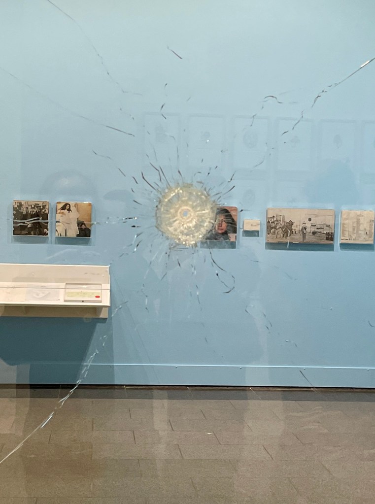 Während beispielsweise das 2009 entstandene Werk „A HOLE” (Abb. oben) beide Seiten eines Verbrechens vorstellbar macht, indem die Besucher:innen das Durchschussloch aus der Tätersicht oder, sofern sie hinter die andere Seite der Glasscheibe treten, aus der Opferperspektive betrachten können (Gänsehaut!), ist die einzige Hoffnung in der Arbeit „ADD COLOUR (REFUGEE BOAT)“, dass so viele Menschen (Museumsbesucher:innen) wie möglich sowohl Wand als auch Boot vollständig mit Blau bemalen. Blau wie das Meer, in dem täglich flüchtende Menschen ertrinken oder an den EU-Außengrenzen scheitern: