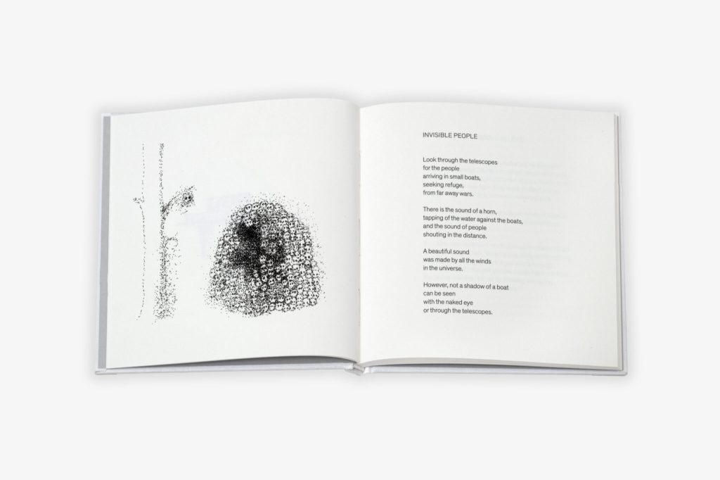 Suchen Sie durch die Teleskope nach den Menschen, die in kleinen Booten ankommen und Zuflucht vor weit entfernten Kriegen suchen. / Man hört ein Horn, das Klopfen des Wassers gegen die Boote und in der Ferne schreiende Menschen. / Ein wunderschönes Geräusch wurde von allen Winden des Universums erzeugt. / Doch mit bloßem Auge oder durch die Teleskope ist kein Schatten eines Bootes zu erkennen.4